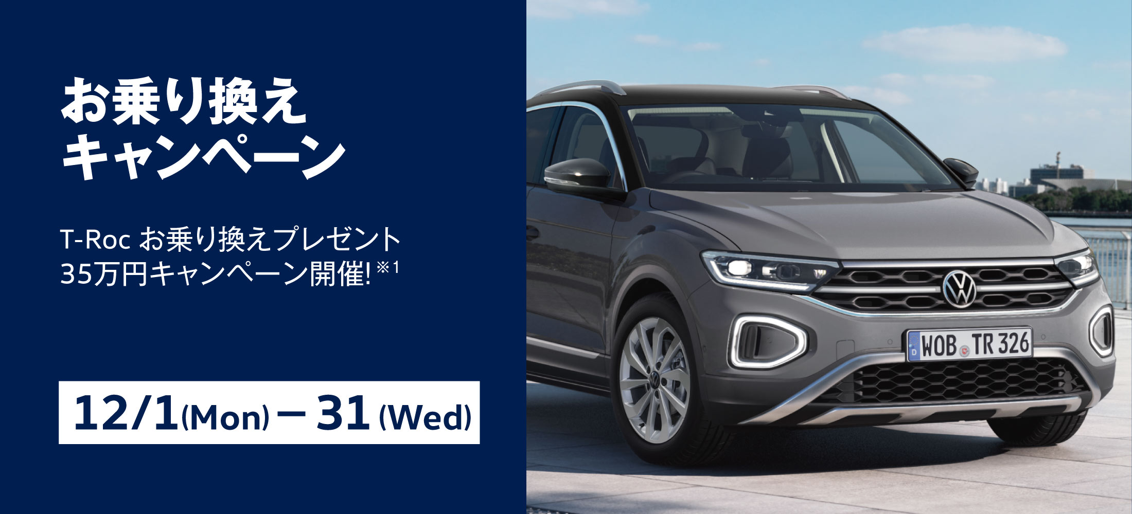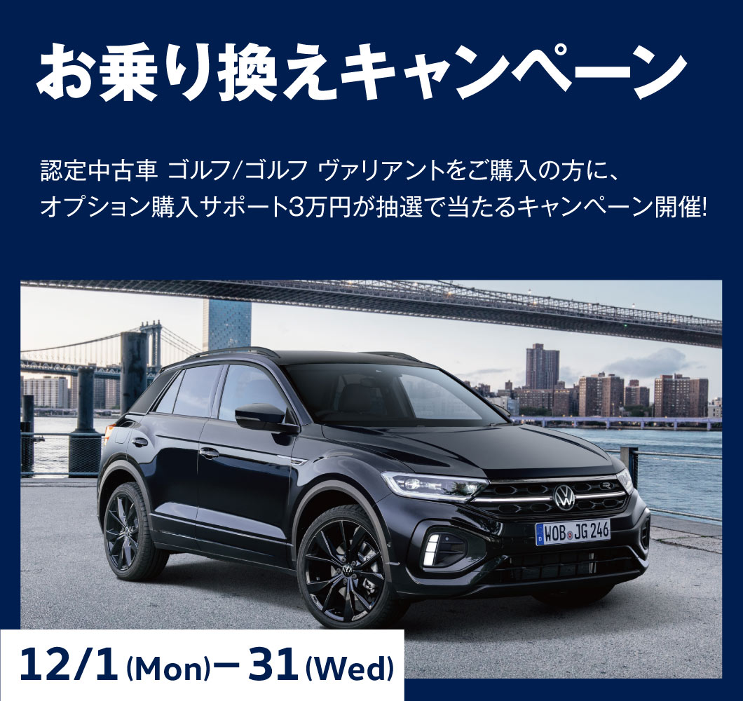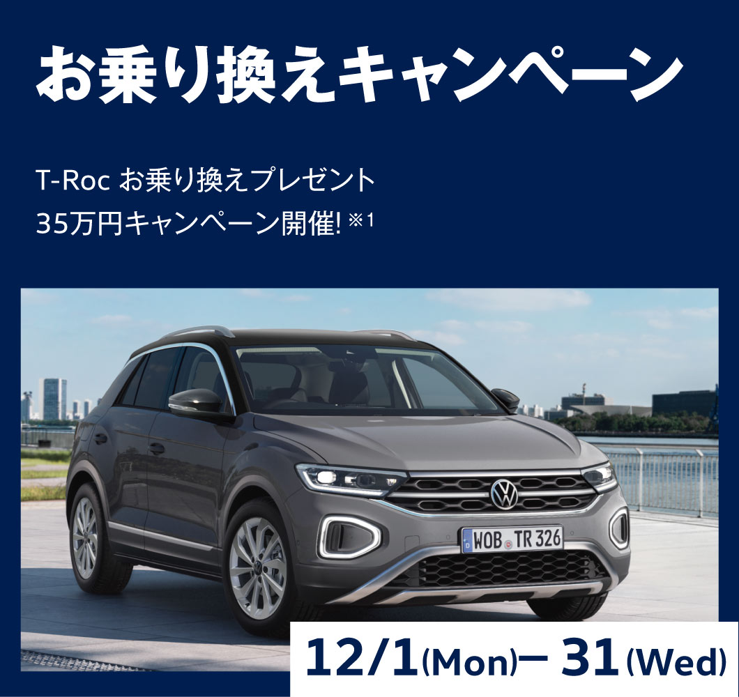 対象条件:期間中にT-Roc(新車)をご成約および2025年12月31日までに車両登録を完了された方。(キャンペーン申込み前にすでにご成約済みの方は対象外、同時に行われているキャンペーンとの併用はできません)